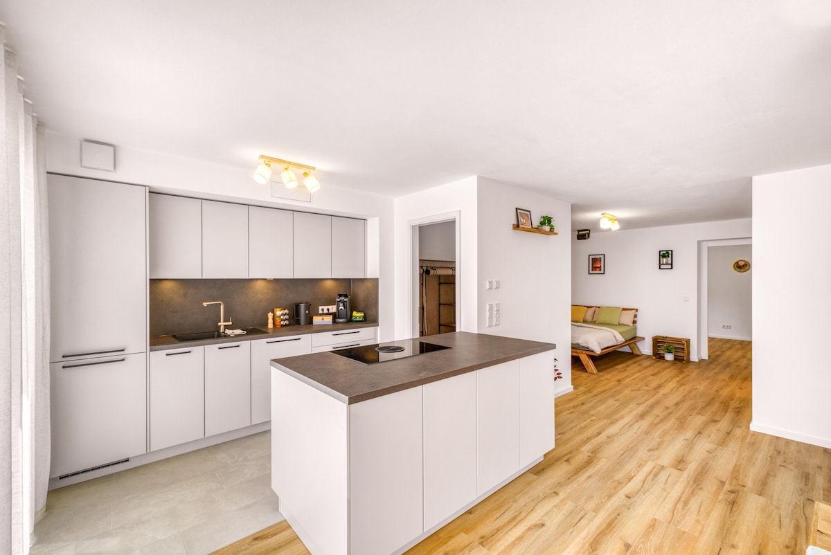 Stylish very spacious and bright new apartment with high-quality equipment in the center of Erding, close to Therme/Erdinger Weißbräu. The apartment is situated by an idyllic stream with views of the countryside and is centrally located. There are plenty of shops, cafés and restaurants in the nearby area. Great starting point for all kinds of excursions City park, swimming lake, S-Bahn (suburban train) connection within walking distance, Close to Munich Airport and the Munich Exhibition Centre Ideal for spa guests, business travelers and families