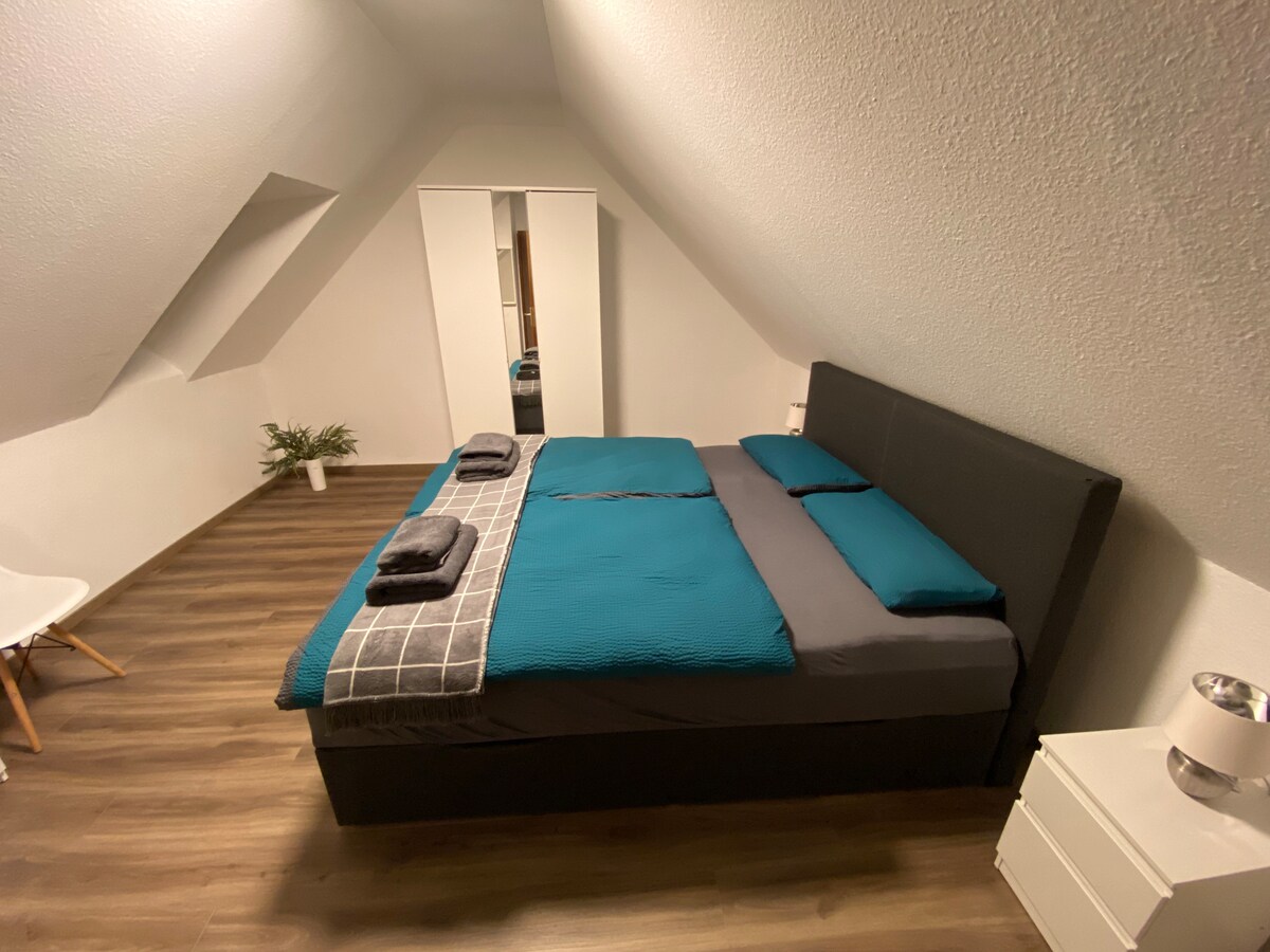 Take it easy at this unique and tranquil getaway. The attic apartment on the 3rd floor offers 2 bedrooms, 1 living & dining room, kitchen and bathroom. The house is a new building and accordingly the interior is in bright and friendly colors. The apartment is in a quiet location and has a beautiful view of the countryside, where you can relax from everyday life. Amenities: underfloor heating, complete kitchen including dishes, etc., walk-in shower, floor-to-ceiling windows in the living room, kitchen and dining area.